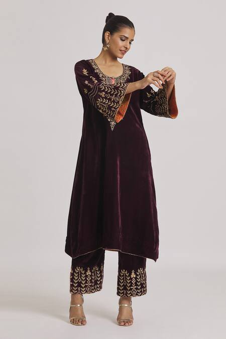 Wine velvet kurta featuring floral hand and machine embroidery with flared sleeves. Paired with a matching pyjama with intricate embroidery at the hem.