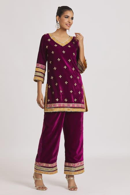 Maroon velvet kurta featuring floral motif embroidery with contrast borders. Paired with matching pyjama for a complete look.