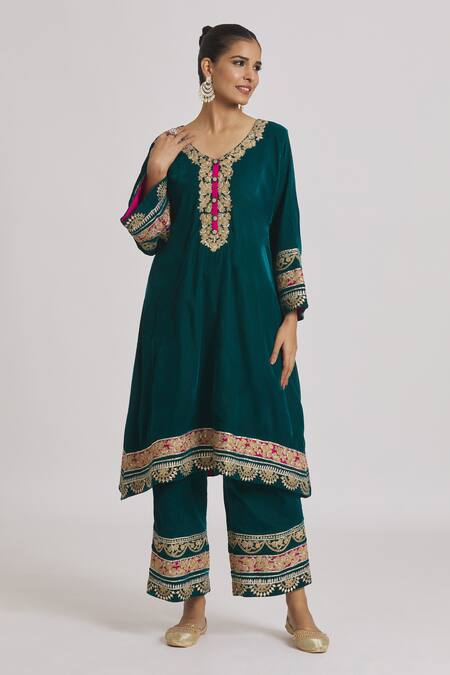 Blue velvet kurta featuring floral embroidery, V neck, and bell sleeves. Paired with a matching pyjama with embroidered details at the hem.