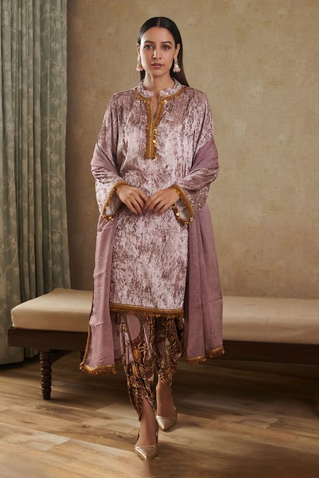 Pink velvet kurta featuring lace detailing on the neckline and sleeve hems. Paired with an abstract printed dhoti pant and a coordinating dupatta.