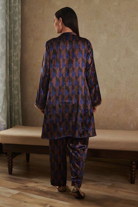 Brown kurta featuring abstract print, side pockets, and a band collar. Paired with coordinating velvet pants.