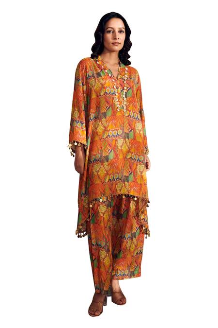 Orange kurta featuring full sleeves, V neck, and an asymmetric hem with Art Nouveau print. Paired with matching print pant, adorned with cowrie shell embellishments.
