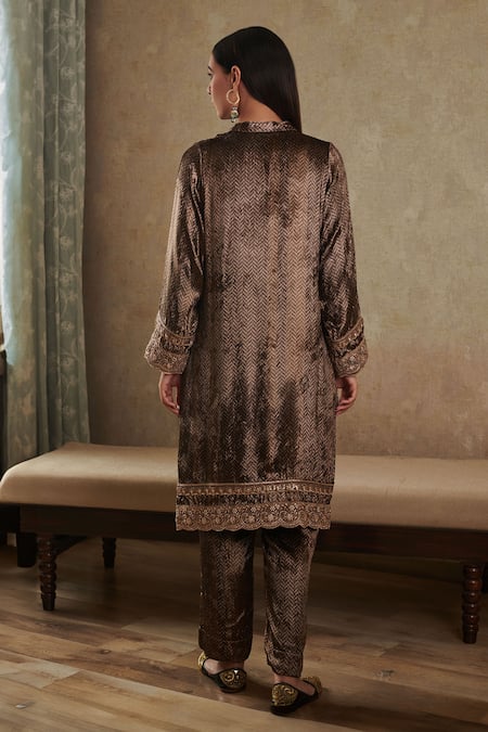 Brown velvet kurta featuring a chevron pattern with lace detailed scallop hem. Paired with matching pants for a complete look.