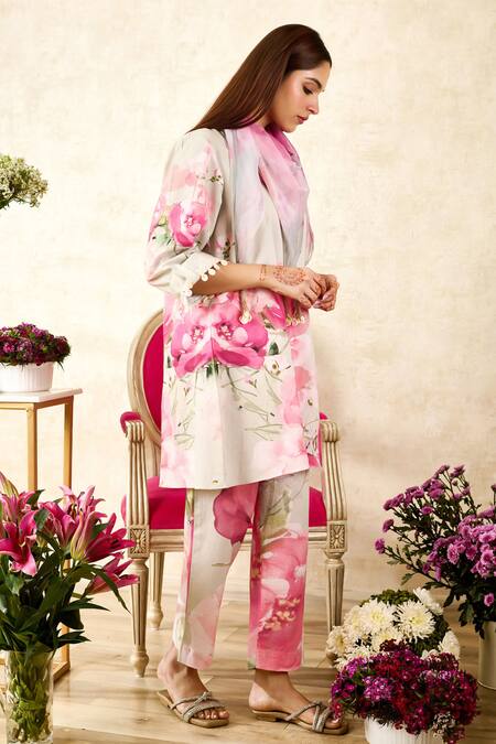 Beige kurta featuring floral print with a mandarin neckline and three-quarter sleeves. Paired with printed pants and a tassel hem scarf.