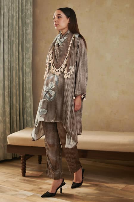 Brown kurta with flower print and tassel detailed sleeve hem. Paired with coordinating pant and scarf.