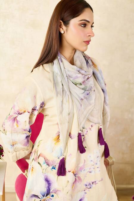 Beige kurta featuring an all-over flower print with a mandarin neckline and three-quarter sleeves. Paired with printed pants and a tassel hem scarf.