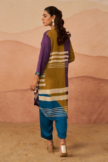 Mustard pathani tunic featuring abstract print, long sleeves, and a band collar. Paired with matching pants that are partially elasticated for comfort.