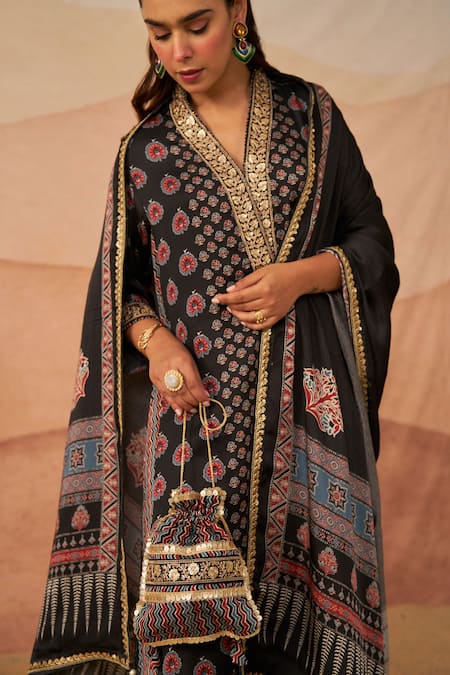 Black Satin, Silk, Cotton Satin, Chiffon Kutch Butti Ajrakh Print Kurta Pant Set