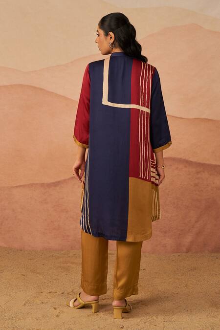 Multicolor colour block pathani kurta featuring a mandarin collar, three-quarter sleeves, and placed sequin embellishments. Paired with relaxed fit pants that are partially elasticated.