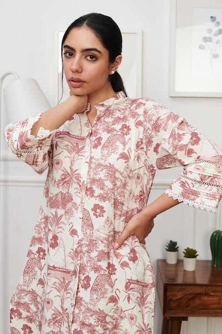 Off White Linen Collared Safari Print Kurta With Tulip Pant