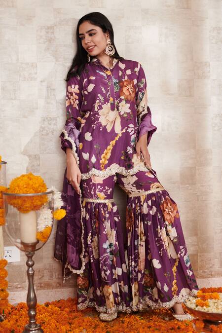 Purple kurta featuring floral prints and embellished scallop hem. Paired with a matching gharara and dupatta with scallop detailing.