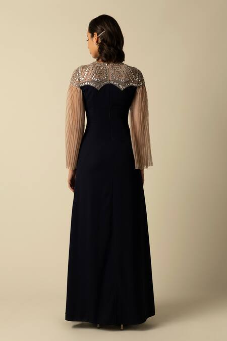 Navy blue gown featuring a round neckline with crystal and bead embroidery in a geometric pattern