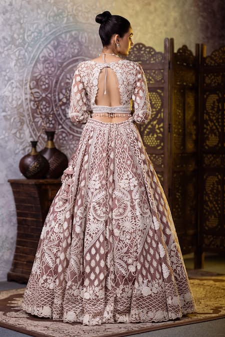 Blush net lehenga featuring intricate dori, sequins, and beaded embroidery. Paired with a padded blouse and a matching dupatta.