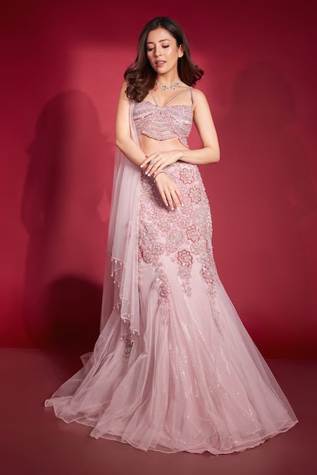 Pink fish cut lehenga featuring crystal, cutdana, sequins and Swarovski embroidery in a floral pattern. Paired with a padded embroidered blouse and a matching dupatta with crystal drop details.