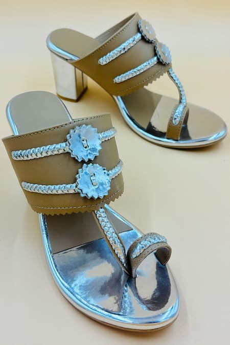 Brown kolhapuri heels featuring a braided woven strap and round toe detailing