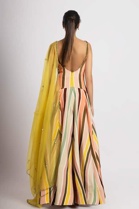 Multicolor anarkali with stripes & chevron prints, waist cut-out and crystal embellished yoke. Comes with a crystal embellished yellow dupatta.