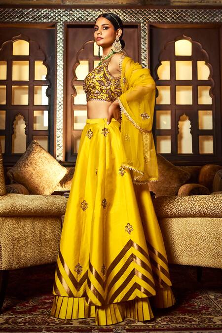Yellow Net, Brocade, Tafetta Motifs, And Stripes Lehenga Set
