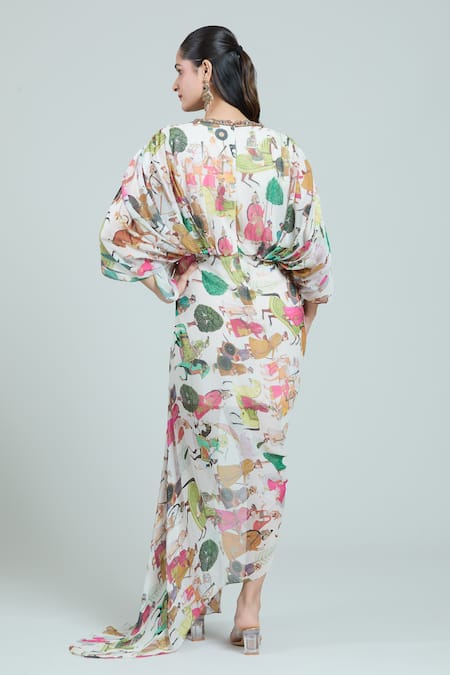Ivory draped kaftan dress featuring all-over multi-colored Mughal art inspired figurine prints