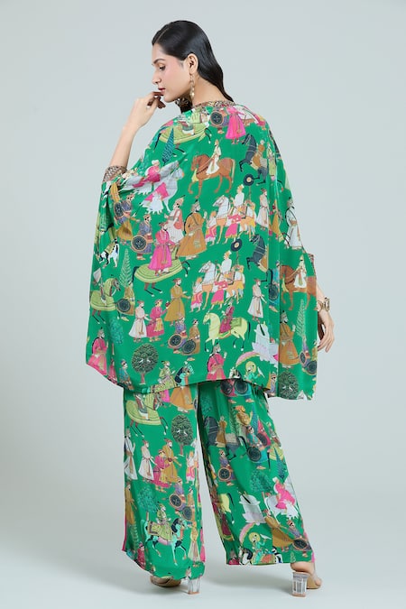 Green kaftan featuring multi-colored Mughal art prints with hand embroidered collar and cuffs. Paired with coordinating printed pant with pink side patti detail.