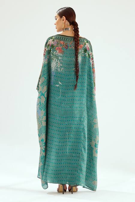 Green kaftan featuring geometric and floral prints with batwing sleeves