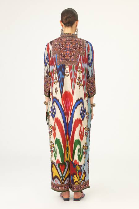 Multi color tunic crafted in silk featuring an abstract print with a contrast geometric print yoke and cuffs