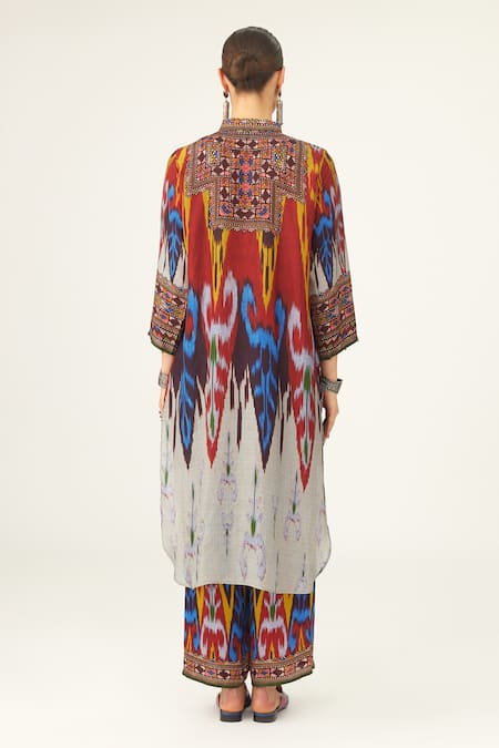 Beaded detailing on sleeves, Geometric pattern design, High-low hemline