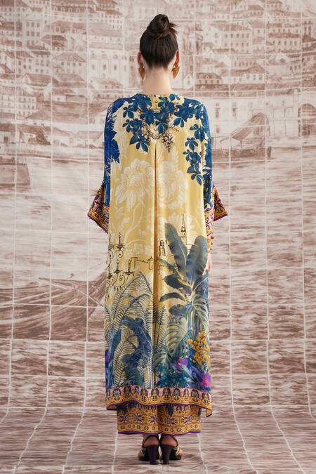 Yellow Silk V-neck Banera Floral Print Kimono Tunic And Flared Pant Set