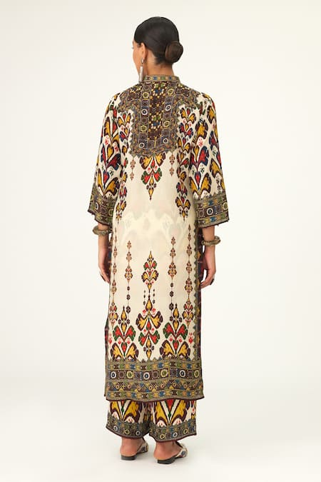 Beige silk tunic featuring geometric patterns, cuff sleeves, and a band collar