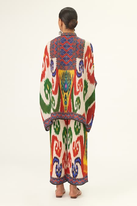Abstract print design with vibrant colors, Front button closure for easy wear, Flared sleeves for added style