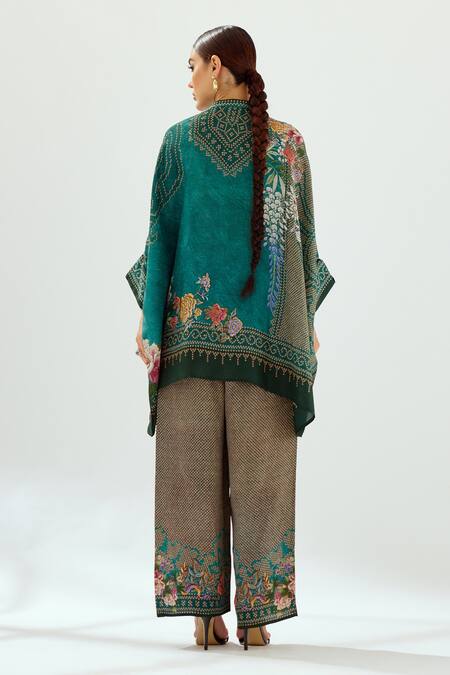 Teal silk tunic featuring floral and geometric patterns with a round band neckline and batwing sleeves