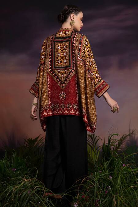 Yellow & red cape-style short tunic all-over printed motifs, asymmetric hem & batwing cuff sleeves.