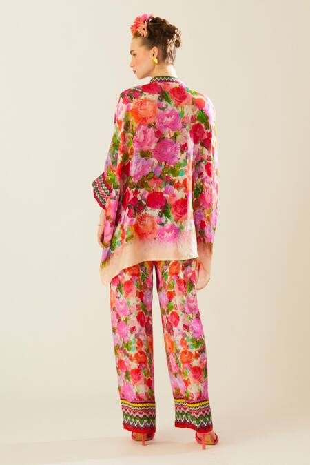 Coral silk top featuring a flower print, band collar neckline, and long sleeves