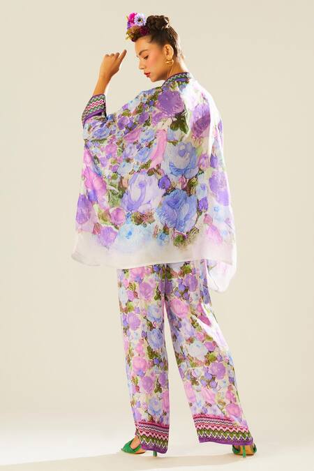Purple Silk Embroidery Bandeau Neck Chanel Flower Print Top