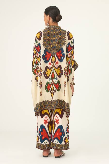 Beige tunic featuring batwing sleeves, band collar, and geometric pattern