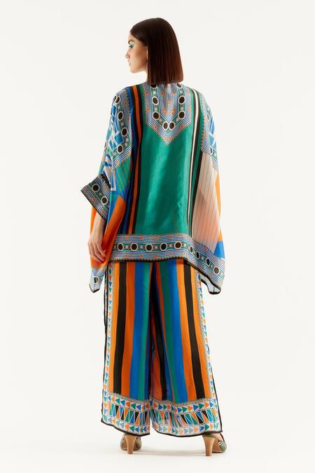 Peacock green tunic with geometric printed motifs, cuff sleeves & band collar.