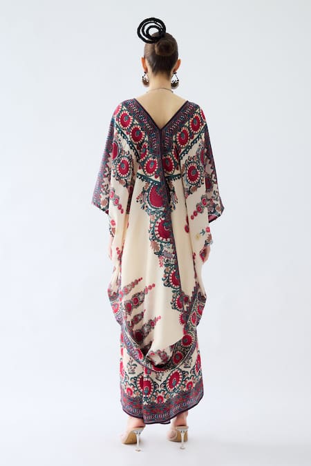 Maroon Silk V-neck Dalilah Floral Print Kaftan Tunic