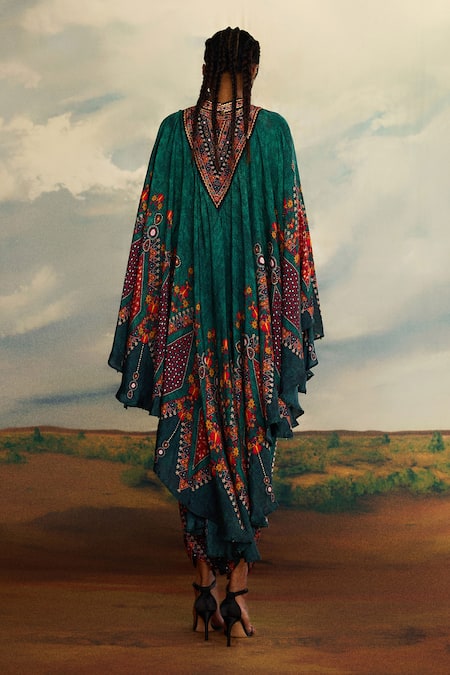 Green Silk Embroidery Bandeau Farah Boho Floral Print Kaftan With Dhoti Pant