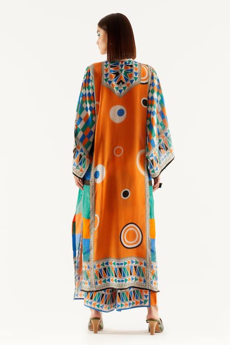 Orange Silk, Satin Geometric Band Collar Gayatri Tunic And Layered Pant Set