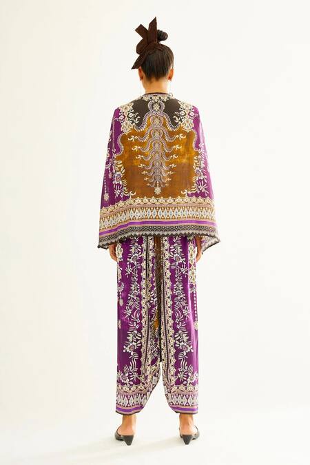Purple satin Turkish pant with floral printed motifs.