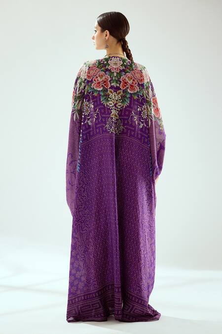 Purple silk kaftan featuring a V-neckline, batwing sleeves, and an embellished belted waist