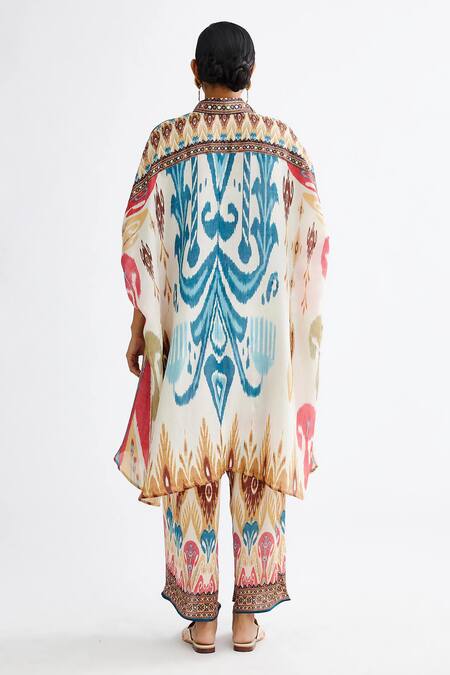 Multi Color Silk Embroidery Collared Kamara Abstract Print Shirt Tunic With Pant