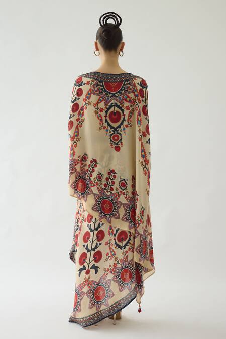 Beige & maroon slit sleeves asymmetric cross cut boat neck long top with all over gardenia fleur print. Paired with a matching print side tucked up skirt.