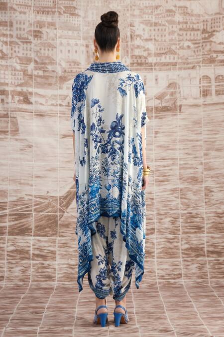 Blue and white floral printed tunic featuring a cowl neck and drop shoulder sleeves. Paired with a matching printed dhoti pant with an asymmetric hem.