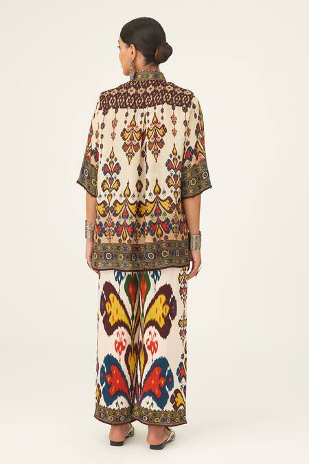 Beige Silk Beads Shawl Neck Maizah Geometric Pattern Shirt