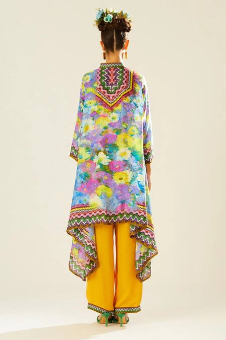 Multicolor silk draped tunic featuring a band collar and long sleeves
