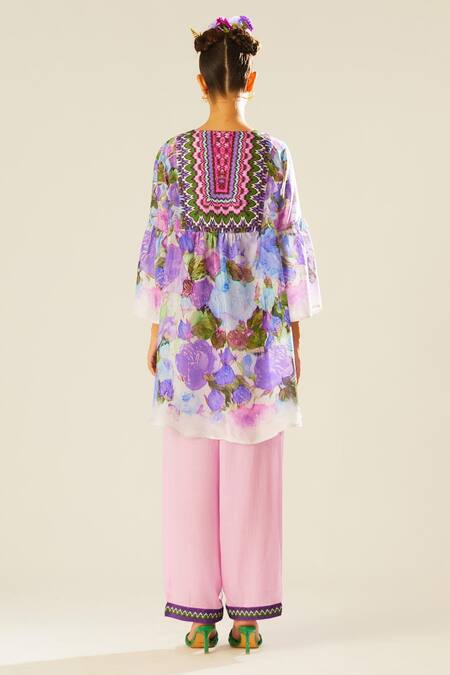 Purple Silk Keyhole Neck Pankti Floral Print Top