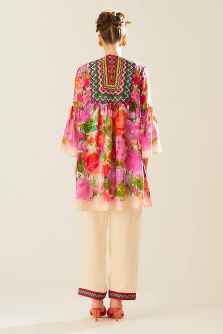 Coral Silk Tassels Keyhole Neck Pankti Flower Print Top