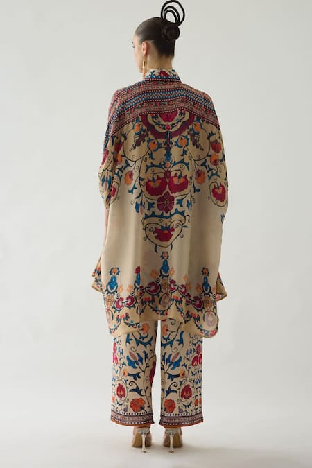 Beige Modal, Satin Permaz Floral Vine Print Flared Pant