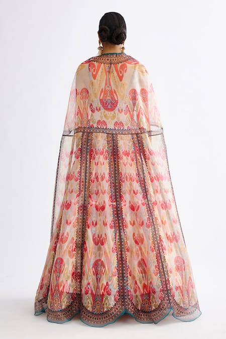 Pink abstract printed lehenga featuring an attached cancan and side tassels. Paired with a matching bralette and organza cape with scalloped hem.