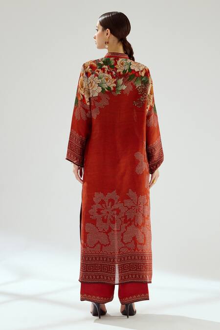 Rust printed silk kurta featuring a band collar and button front placket